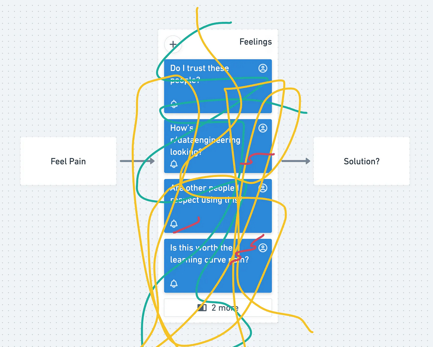 That’s what everyone says off the cuff, but we all know it’s hollow. You hate it when a sales guy connects with you on LinkedIn, waits a day, and messages that same line (cough cough, I’ve sent and received those messages to much dread). Even this doesn’t feel specific enough, “My Snowflake bill feels high.” The pain that motivates you to talk to a stranger like me must be both acute AND chronic. It’s a specific story on loop in your head each time you touch your DAG. You will note something that’s inconvenient until it happens often enough where you believe it’s detrimental. What you thought was joint pain is feeling more like arthritis (Bengay isn’t enough to your dismay). The slow drudgery of your job melts willpower to change anything except keep your head above water. But you know deep down, atrophy only makes it worse. You can’t work like this anymore (this is a judgement free zone):